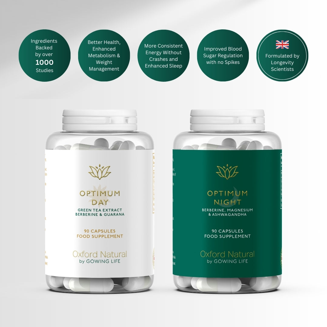 Optimum Day contains Guarana, Green Tea Extract, Berberine, L-Carnitine, Calcium Alpha-Ketoglutarate, and 5-HTP. Optimum Night includes Magnesium, Ashwagandha, Berberine, L-Carnitine, Calcium Alpha-Ketoglutarate, and 5-HTP.