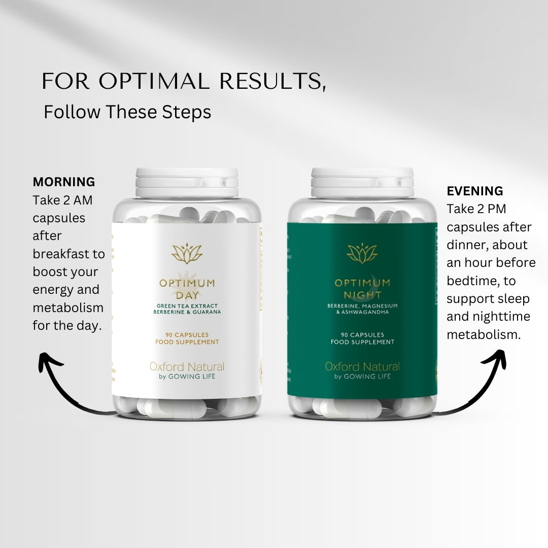 Optimum Day supplements enhance metabolism and energy levels, helping to burn calories and reduce appetite. Optimum Night supplements promote restful sleep and continued metabolic support, aiding in the regulation of blood sugar levels and reducing late-night cravings, which supports overall weight management.