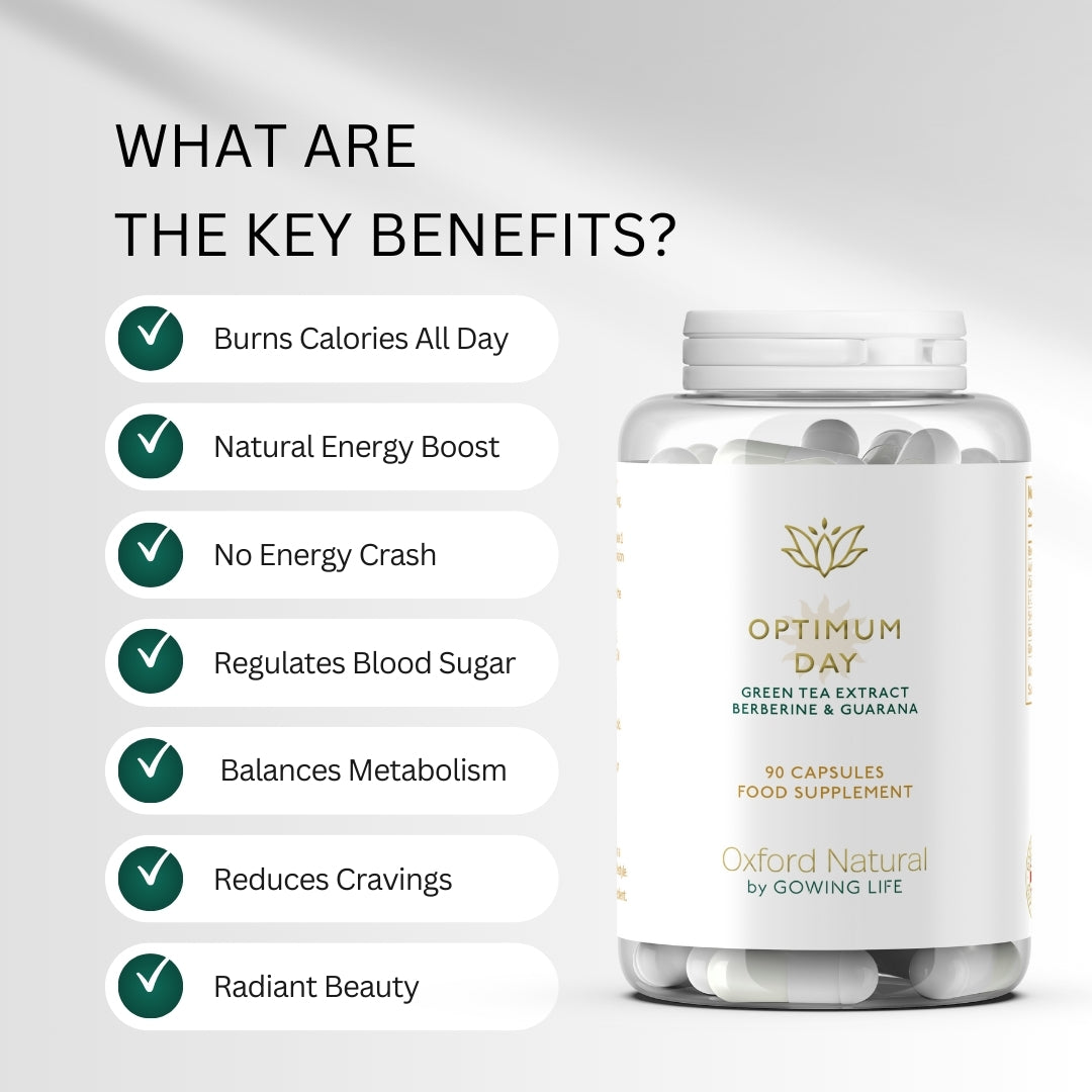 The Optimum Day supplement is a strategically formulated morning stack, blending Guarana and Green Tea extract for sustained energy, metabolic rate enhancement, and promotion of weight loss. The potent components including, Berberine act in unison to help regulate blood glucose levels, while L-Carnitine offers a wide spectrum of further metabolic benefits. Coupled with Calcium Alpha-Ketoglutarate, this stack not only targets optimal fat metabolism, but also embraces an innovative approach to longevity, underlined by groundbreaking epigenetic research. Meanwhile 5-HTP upregulates serotonin synthesis, enhancing mood and decreasing appetite, encouraging further natural weight loss.