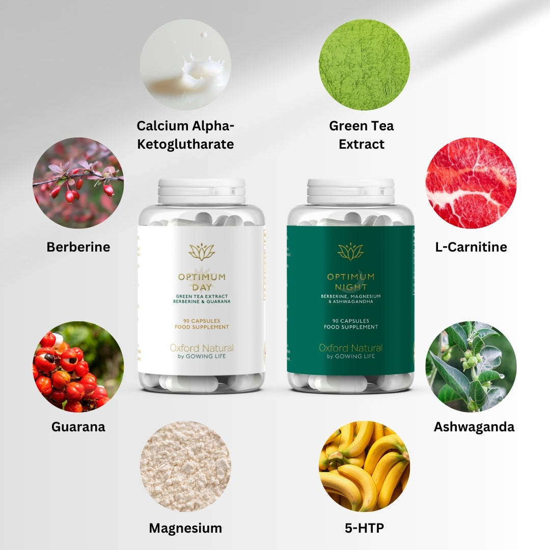 Optimum Day contains Guarana, Green Tea Extract, Berberine, L-Carnitine, Calcium Alpha-Ketoglutarate, and 5-HTP. Optimum Night includes Magnesium, Ashwagandha, Berberine, L-Carnitine, Calcium Alpha-Ketoglutarate, and 5-HTP.